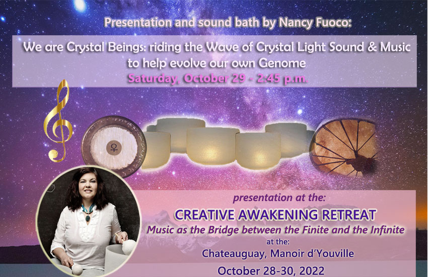 Nancy Fuoco is an intuitive channel, sonotherapist and an experienced meditation facilitator. She has been offering workshops on emotional wellbeing, sound healing and therapeutic concerts for the last 20 years. As well as leading spiritual retreats in Mt. Shasta, CA, and in the Laurentians to evolve soul connection and opening to the inner Goddess, she has long pursued studies and taught on the subjects of Lemurian healing and reconnection, spiritual psychotherapy, sound healing and vocal therapy, rebirthing, crystal healing and understanding consciousness through the rays of light (color, sound and light therapy). To know more about her, you can visit her website at: www.theresonantheart.com
